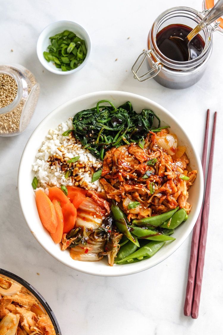 Do misky dej vrstvu rýže, přidej špenát, mrkev, fazolky a „trhané vepřové“ z jackfruitu. Můžeš pokapat trochou sójové omáčky nebo sezamového oleje pro extra chuť.